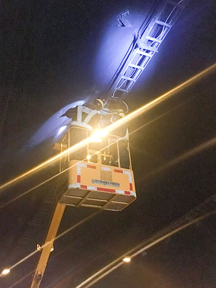 中午11:00,因流量過大,高速交警要求臨時開放被堵主車道。趁此空隙機會,中心隊伍暫撤到黃土嶺隧道管理所解決午餐,之后又馬不停蹄奔赴并集結在北洞口緊急停車帶,待重新封道后繼續(xù)跟進作業(yè),力爭在審批時間內做更多的維修。考慮到主車道燈具損壞不多,抽調一組登高車人員負責攝像頭檢修工作,而底下人員則負責修復更換消防、緊急電話等標志燈,每組人員都在與時間賽跑,忙的顧不上喝水。
