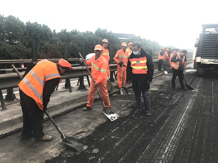 12月4日,難得的晴好天氣,甬臺溫高速公路臺州段一期路面專項養護攤鋪現場,工人緊張而忙碌作業。施工一旁,另有三位身著反光背心、頭戴帽子、腳穿布鞋的人員正目不轉睛地注視著攤鋪機作業,時不時指點工作,他們是集團路面專項養護綜合督查組成員邵克、馮濟爐和葉榮江。