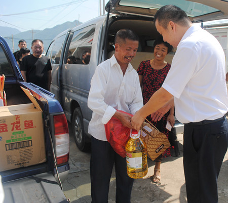 圖為臺(tái)州收費(fèi)所黨支部書(shū)記王小勇給困難戶(hù)送上慰問(wèn)品