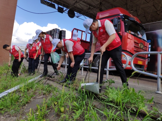 圖為志愿者合影 活動現(xiàn)場,身著紅馬甲的志愿者們,拿著垃圾夾、垃圾袋、掃把、畚斗等工具,重點清理收費站內(nèi)外廣場的煙頭和白色垃圾。由于上下高速時有不少司乘人員直接把垃圾丟向兩側(cè)邊溝,導(dǎo)致收費所兩側(cè)邊溝垃圾較多。盡管天氣炎熱,但志愿者們自行分組,三人一組、五人一隊,充分發(fā)揮不怕苦不怕累不怕臟的精神,并互相配合集中對一些死角進行清理。