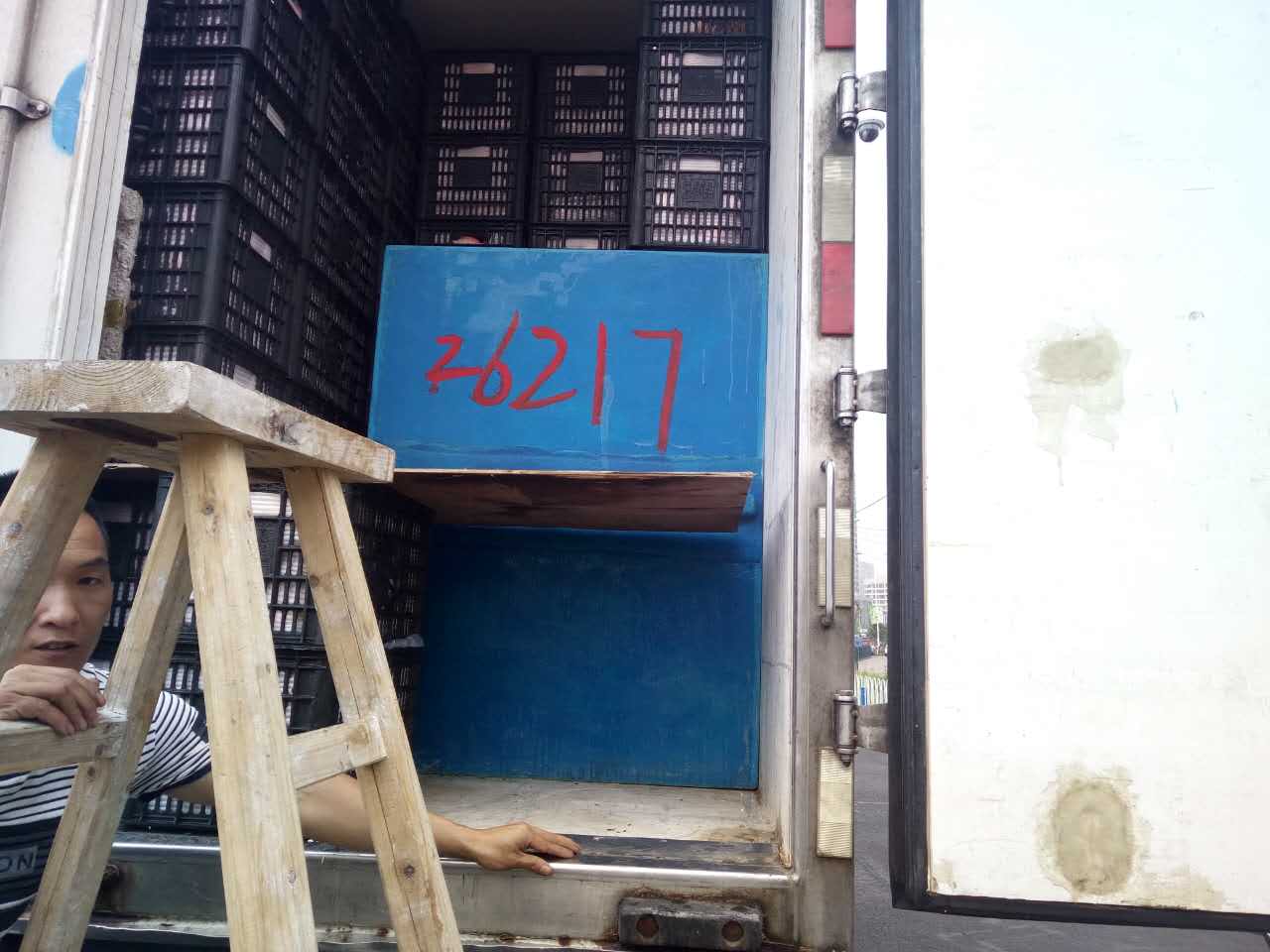 圖為被處罰的車輛 早上10點40分左右,這輛運蘋果的貨車駛入收費站的一號崗亭,司機師傅說自己運的是蘋果,根據公司規定,綠農車檢查必須開車門檢查貨物。憑著多年的檢查經驗,當班班長童軍偉發現這輛綠農車有問題,覺得重量遠遠不夠,可能不符合“綠農”免費政策。果不其然,車廂中“深藏玄機”,左右兩側各有一排玻璃鋼魚箱,這就給檢查增加了難度。當班班長要求司機師傅把最后兩排箱子拿掉,想檢查玻璃魚缸,然而這個司機極其不配合,還惡意刁難工作人員,說什么也不搬蘋果。