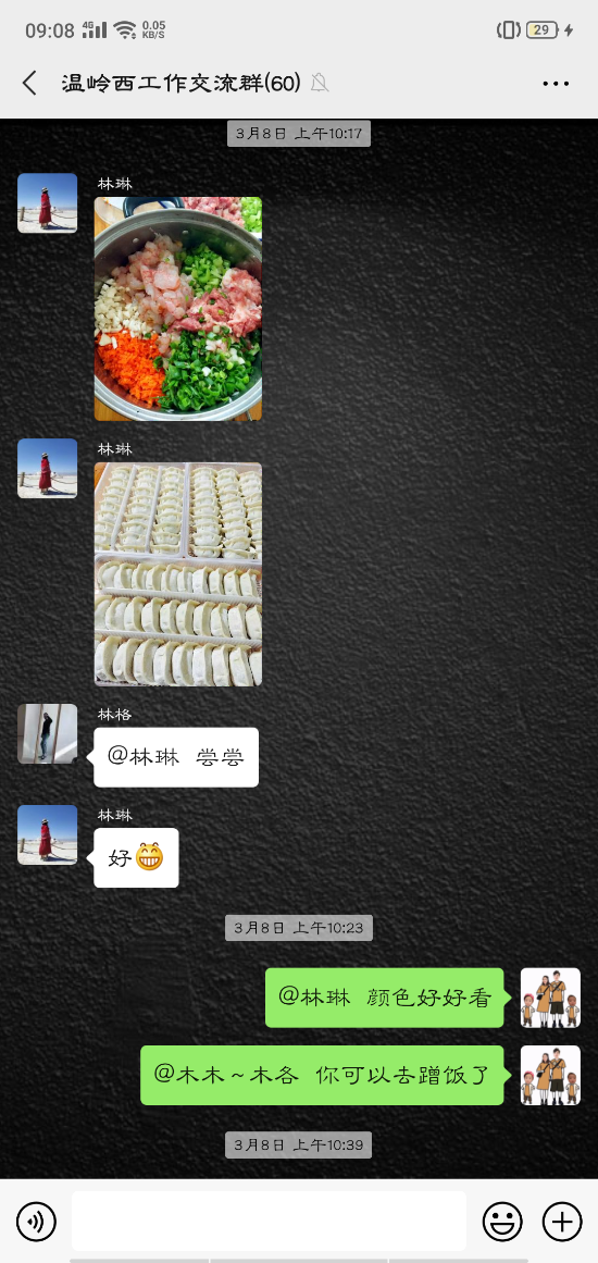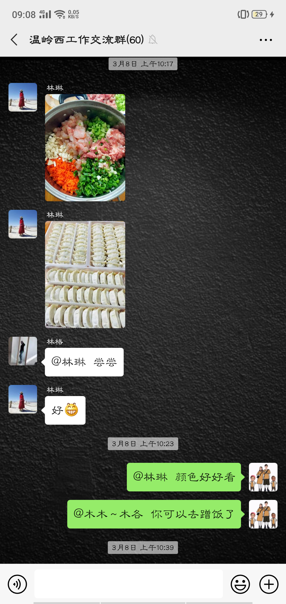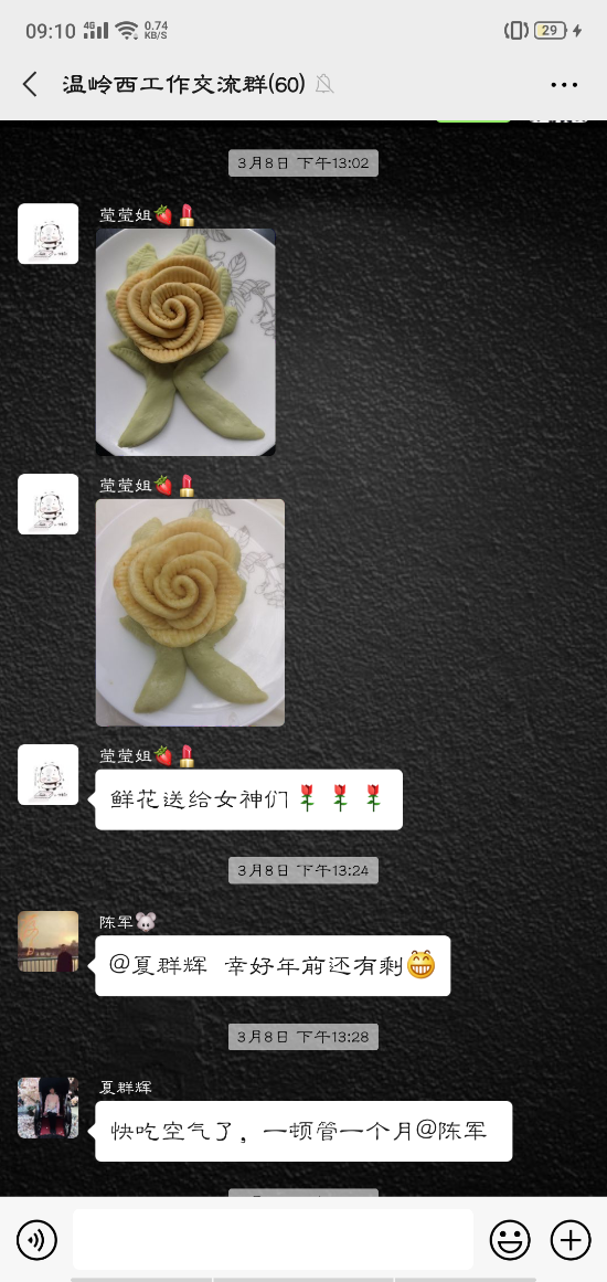 活動中,大家的參與性都很高,紛紛在微信群內(nèi)曬出自己制作的美食:鹽焗雞、可樂雞翅、蔥油角角魚、溫嶺小吃豬肉飯、玫瑰南瓜饅頭……紛紛亮出了自己的拿手好菜,在群里談論得熱火朝天的同時,也不忘介紹一下自己做的菜。甚至很多男同事也紛紛曬出自己的最佳廚藝,祝福女同胞節(jié)日快樂。