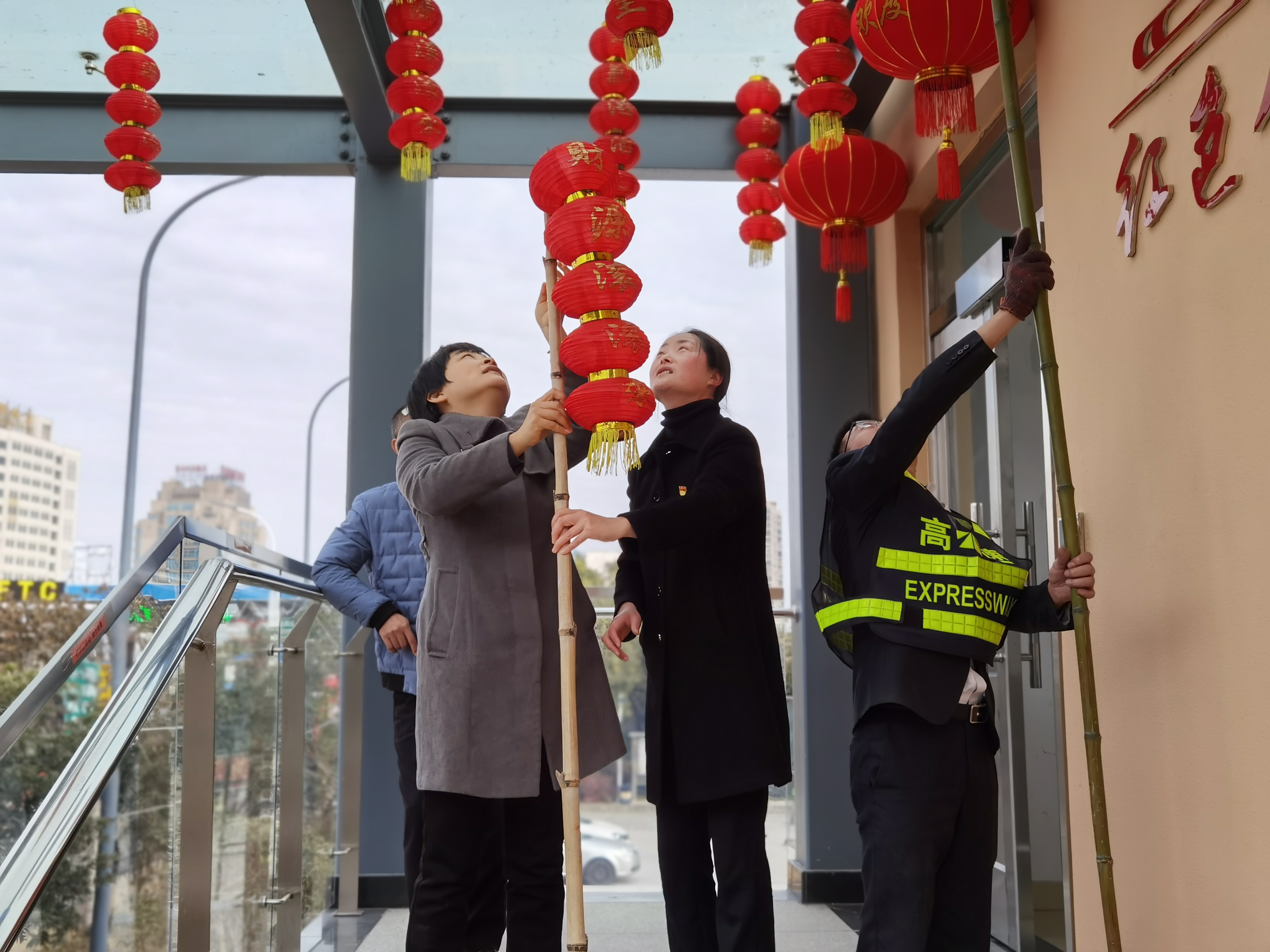 大家分工合作,搬梯子、遞春聯(lián)、貼膠帶、校正高低。在站所內(nèi)每個(gè)角落都掛上了紅彤彤的燈籠;收費(fèi)區(qū)域內(nèi)廣場(chǎng)兩邊的欄桿上扎著一面面彩旗。一幅幅精致喜慶的對(duì)聯(lián)、“福”字,一串串三角彩旗,一個(gè)個(gè)大紅燈籠把整個(gè)收費(fèi)站所點(diǎn)綴得處處洋溢著濃厚的節(jié)日氛圍,“年味”十足,讓在站員工和過往司乘朋友感受到新年的喜慶氛圍和“家”的溫暖。