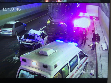 圖為事故現(xiàn)場(chǎng) 情況緊急,一接到指令,巡邏車立即在南廣場(chǎng)調(diào)頭,趕赴事故現(xiàn)場(chǎng)。而此時(shí)較大的車流量已造成后方堵車,導(dǎo)致巡邏車被堵在隧道口,執(zhí)勤隊(duì)員怕時(shí)間耽擱太久,便火速跑到事故現(xiàn)場(chǎng),第一時(shí)間將車?yán)锏娜藛T救出。所幸轎車內(nèi)四人只有一人腳上受傷,中控立即拔打120急救電話。在他們還在施救的時(shí)候,追尾事故卻頻頻發(fā)生,500米左右、1300米左右的超車道上先后發(fā)生兩小車、三車追尾事故,隧道內(nèi)排起了長(zhǎng)龍。為了保證在最短時(shí)間內(nèi)恢復(fù)正常通行,執(zhí)勤隊(duì)員忙著奔赴現(xiàn)場(chǎng)指揮預(yù)警,應(yīng)急救援有序展開(kāi)。 現(xiàn)場(chǎng),監(jiān)控中心、交警、執(zhí)勤隊(duì)等部門分工協(xié)作,整個(gè)施救過(guò)程一直持續(xù)到中午12點(diǎn)多才順利完成。盡管執(zhí)勤隊(duì)員到現(xiàn)在都滴水未進(jìn),但每個(gè)人臉上繃緊的神經(jīng)終于都得到了放松。 林玲