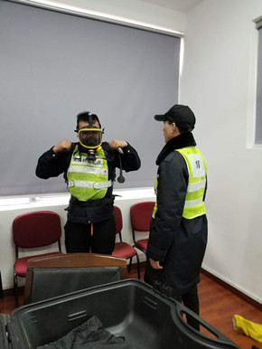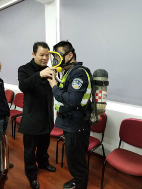 培訓(xùn)中,陶文輝講解了“高速隧道火災(zāi)特點(diǎn)”及呼吸器、防化服的使用方法及相關(guān)要求。話題開啟后,隊(duì)員們紛紛參與討論,爭相發(fā)言,講述各自在隧道事故處理中施救和應(yīng)對的經(jīng)歷與心得,交流平日巡查中所需注意的事項(xiàng),互相提醒工作中的不足,并針對實(shí)際問題提出了許多建設(shè)性意見。同時,在主講人的現(xiàn)場演示下,參訓(xùn)人員逐個“以身試法”,進(jìn)一步熟悉和掌握了防毒面罩的穿戴方法。