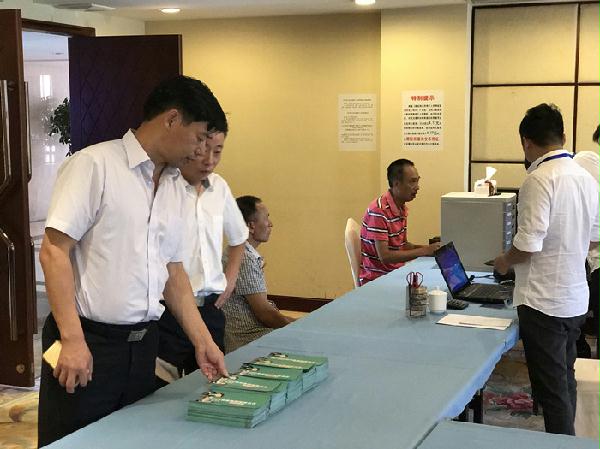 圖為集團副總經理陳保衛正在檢查收購點宣傳資料