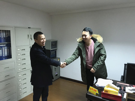 圖為集團副董事長、總經(jīng)理張建平在慰問中與部門員工親切握手