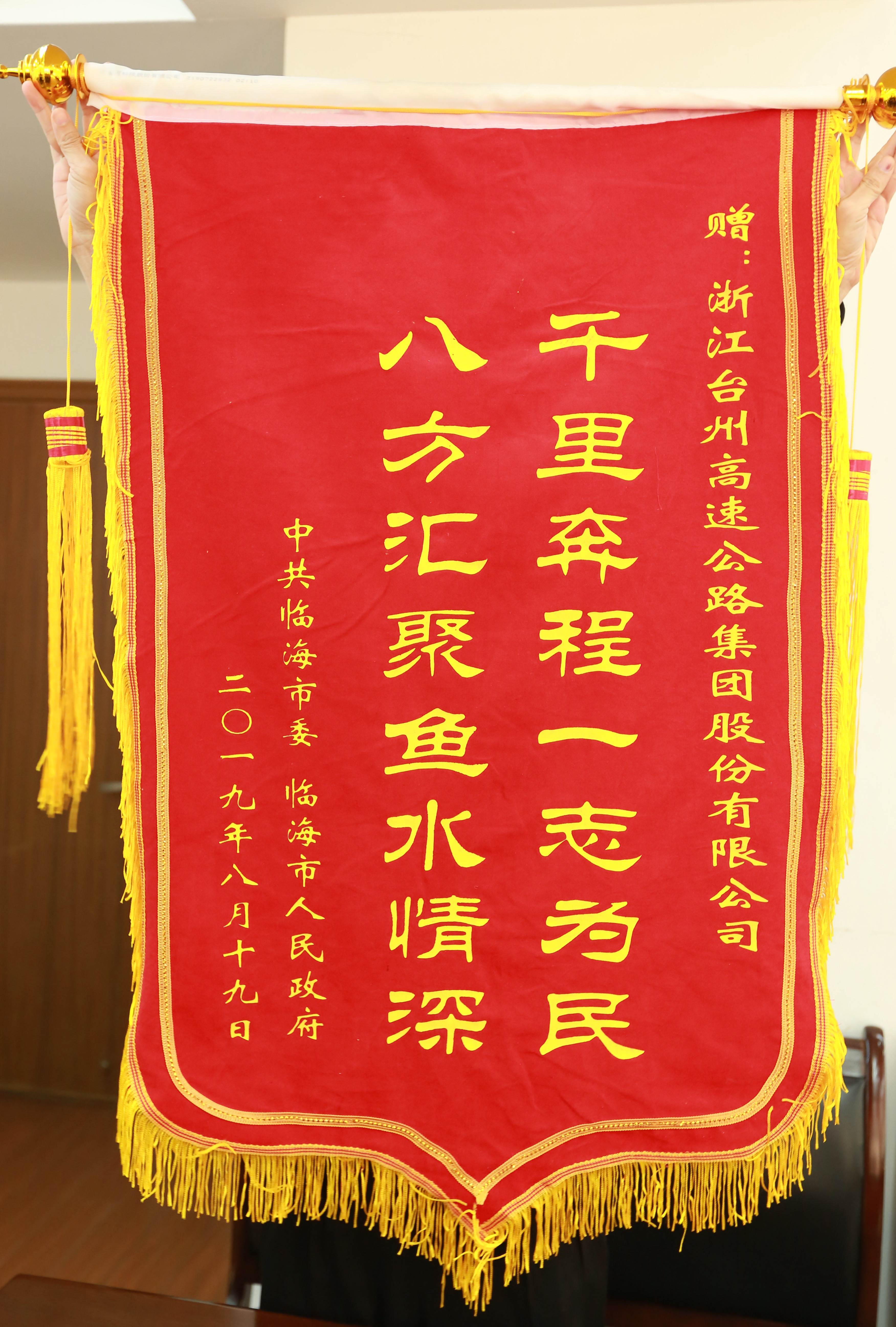 【洪水無情人有情】臨海市給臺州高速集團 送來錦旗和感謝信 今天下午,臨海市市長王丹代表臨海市委、市政府向臺州高速集團送來了錦旗和感謝信,感謝在防御第9號臺風“利奇馬”及災后重建過程中,臺州高速集團給予的大力支援。