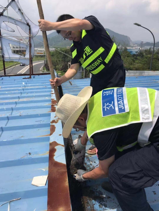 為切實做好今年第9號臺風“利奇馬”各項防御工作,確保臺風期間轄區(qū)高速公路安全暢通,工程部機電設備維養(yǎng)中心提前對集團所轄路面及收費站機電設備進行了全面部署,消除安全隱患,全力防范強臺風。 全面清除收費頂棚及下水管道垃圾。集團沿線收費頂棚經(jīng)過幾次的施工裝修,遺留了一些裝飾垃圾,如不及時清理一旦掉入排水溝或下水管道,勢必會造成頂棚漏水,影響下面人員及設備安全。8月7日,維養(yǎng)中心組織班員在登高車協(xié)助下,頂著炎炎烈日,利用垃圾夾、鐵鍬等工具對沿線收費站收費頂棚上方垃圾、排水溝中的淤泥進行了逐一清理,并重新鋪設排水溝上面的防護網(wǎng),防止臺風期間吹來的一些塑料紙袋等輕型垃圾再次堵塞下水道。