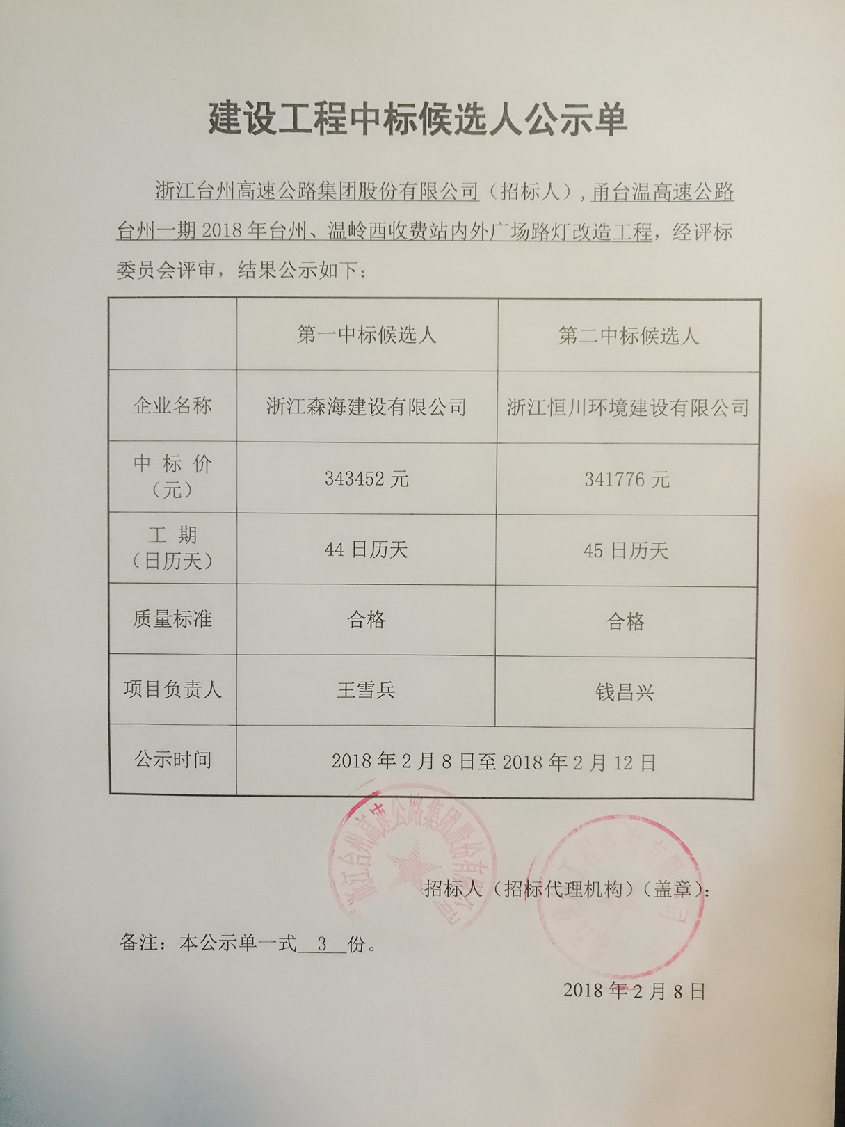2018年臺州、溫嶺西收費站內(nèi)外廣場路燈改造工程中標(biāo)候選人公示單