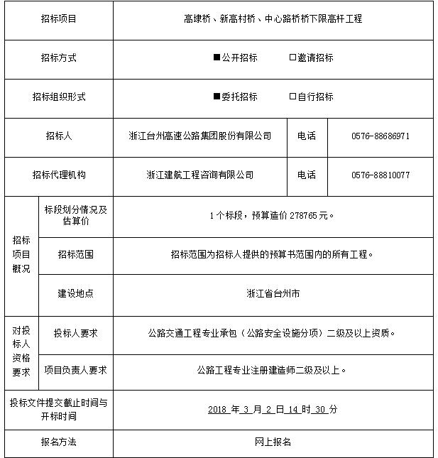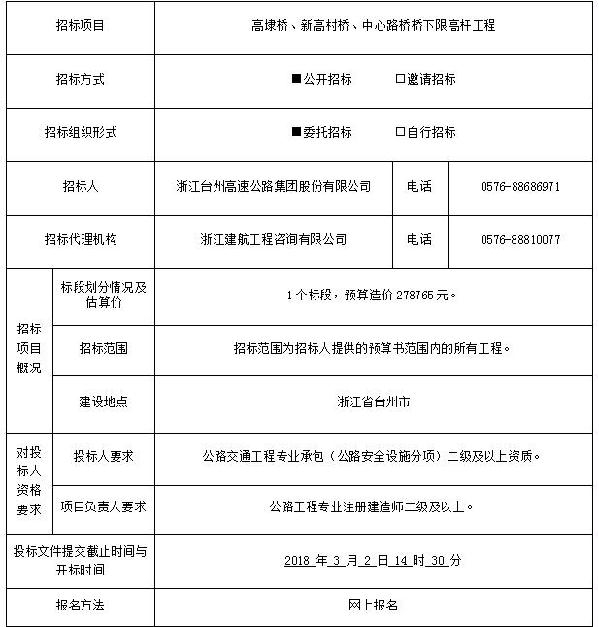 高埭橋、新高村橋、中心路橋橋下限高桿工程招標公告