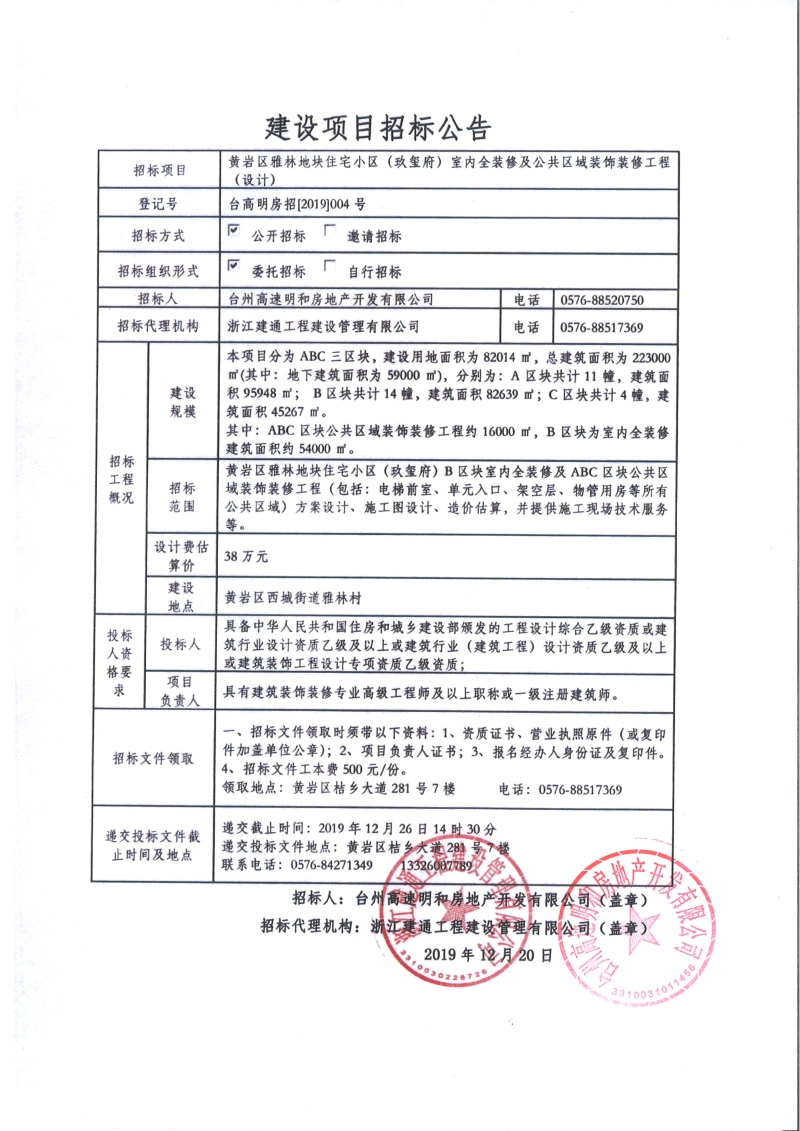 黃巖區雅林地塊住宅小區(玖璽府)室內全裝修及公共區域裝飾裝修工程招標公告