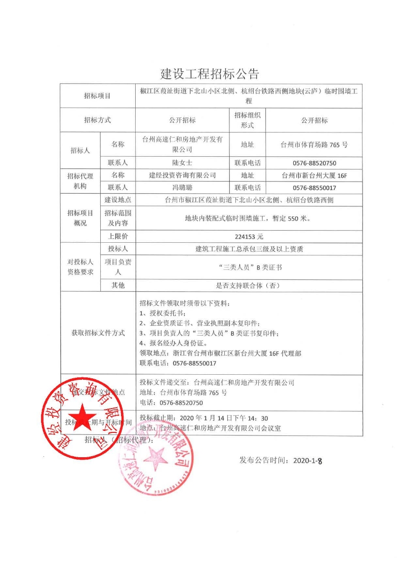 椒江區(qū)葭沚街道下北山小區(qū)北側(cè)、杭紹臺鐵路西側(cè)地塊(云廬)臨時圍墻工程招標公告