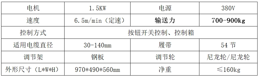 本款輸送機適用于110KV以內(nèi)電纜敷設(shè)。電纜敷設(shè)完成側(cè)面移出,適用于橋架,隧道狹小空間使用。配套電氣箱可聯(lián)動控制,聯(lián)動方式有線/無線聯(lián)動、變速箱免保養(yǎng)。